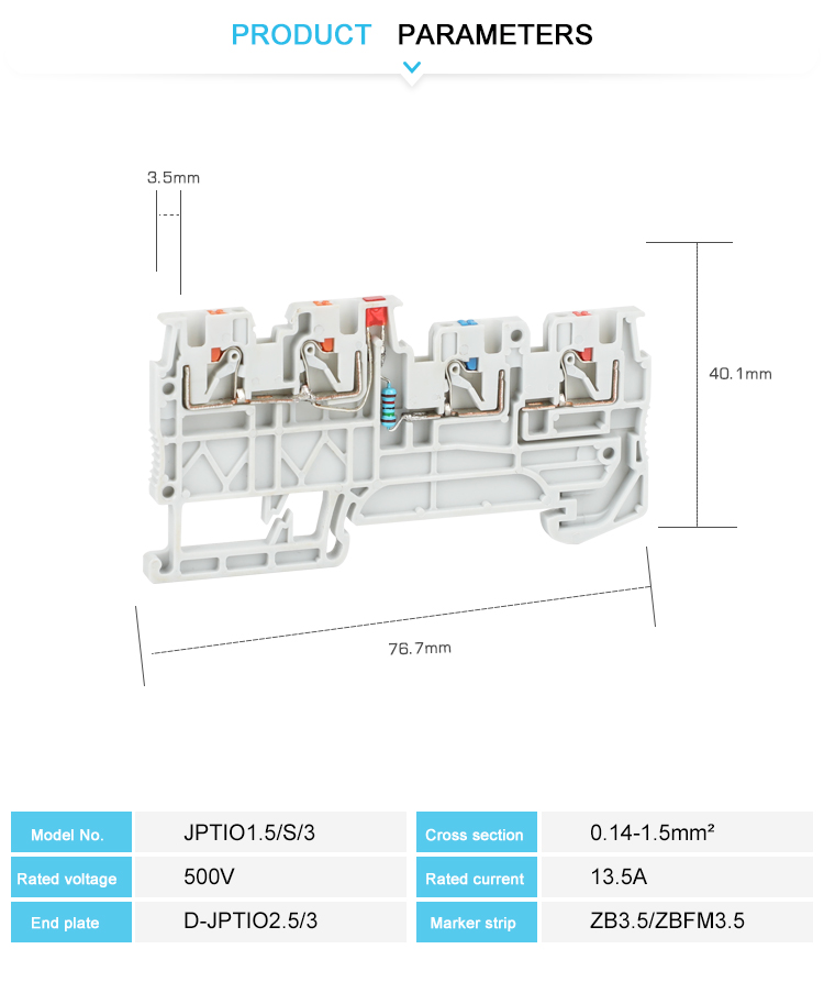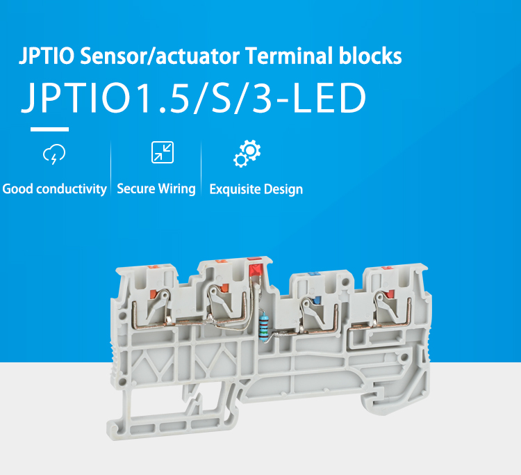 JUPTI1.5 / S / 3-LED (24V) Terminal blokning blokinali blokirovkasi blokirovka qilingan Nylon Pa66, zang dirijor va zanglamaydigan po'latsiz po'latdan yasalgan sinish Bahori elektr xavfsizligi va og'ir ish sharoitlarida mexanik kuchlarni qabul qiladi.