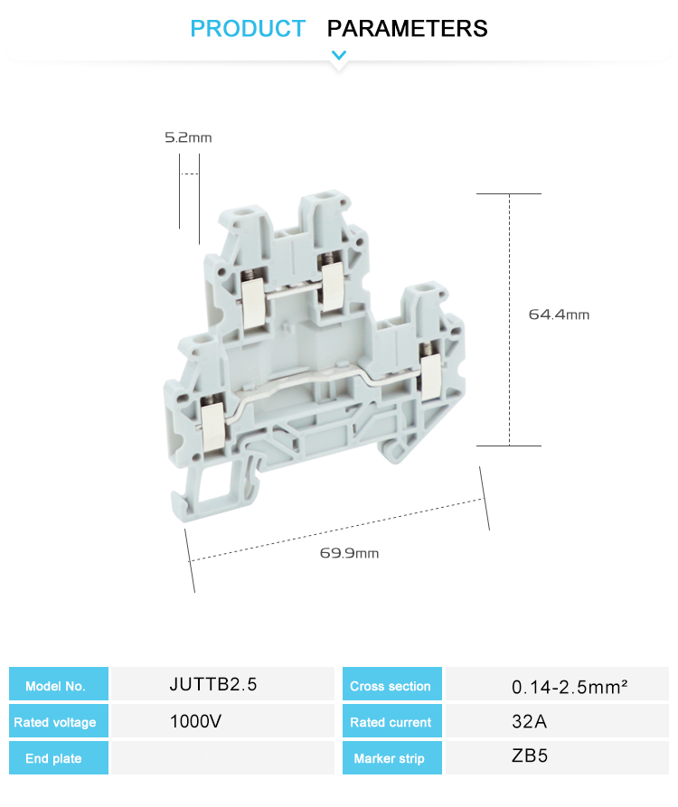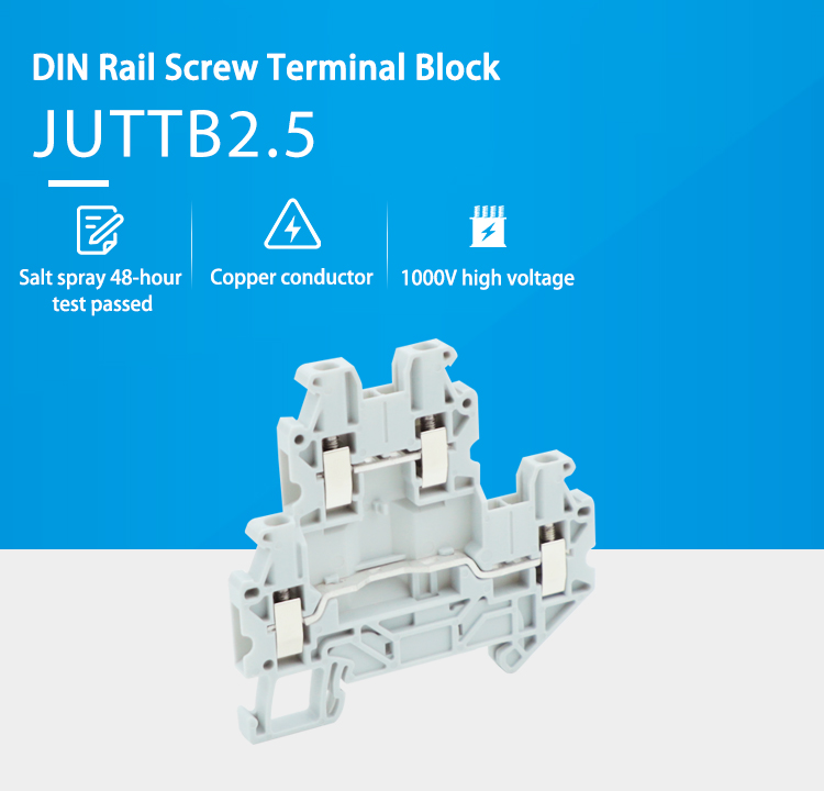UTTB2.5 Ikki bosqichli vidali terminal bloki sanoat va tijorat sharoitida elektr aloqalari uchun maxsus ishlab chiqilgan. 2,5 mm dn hajmli sig'imga ega, u past va o'rta darajadagi stsenariylar uchun mos keladi. Din temir yo'lini o'rnatish oson va ikki bosqichli tuzilma bo'sh joyni tejaydi. Vida ulanish - tebranish va havo o'tkazmaydigan mis simlariga mos ravishda tebranish va havo himoya. Yuqori sifatli alangali peshqadam materiallar issiqlikka chidamli va ta'sirli, sanoat standartlari. Ular boshqaruv kabinetlari, elektr tarmog'ini tarqatish tizimlari va boshqalar uchun mos keladi, va ishonchli aloqa echimlarini ta'minlaydi.