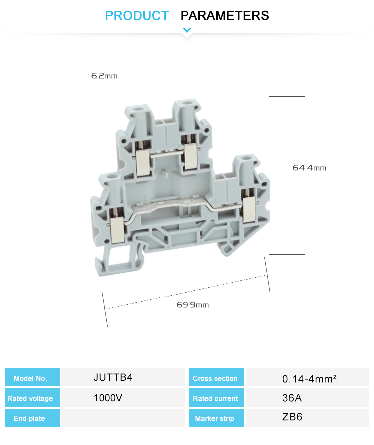 UTTB4 ko'p bosqichli vidali terminal bloki sanoat va tijorat muhiti va yuqori darajadagi tezkor stsenariylar, barqaror ishlashni ta'minlash uchun 4 mm masofaga ega. Ko'p bosqichli tuzilish maydonni tezkor o'rnatish uchun kosmikni optimallashtiradi; Vida ulanish - tebranish va havo o'tkazmaydigan mis simlari bilan mos ravishda tebranish va havo o'tkazgichidir. Yuqori sifatli alangali pushti materiallar issiqlikka chidamli va ta'sirli, sanoat standartlari va zamonaviy tizimlar uchun ishonchli va samarali aloqalarni taqdim etishdir.